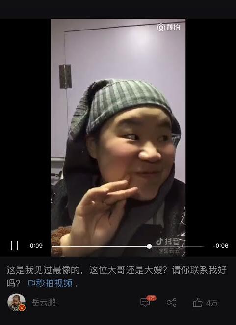 3月13日晚,岳云鹏发布了一条寻人微博,并附上一段视频,称“这是我见过最像的,这位大哥还是大嫂?请你联系我好吗?”微博底下一水的评论都在调侃小岳岳,“这难道不就是你”“不要用你自己的视频忽悠我”,由此可见小岳岳和正在寻找的这位视频中人相似程度有多高。