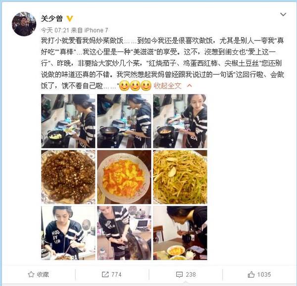 关晓彤爸爸关少曾发微博表扬了一下女儿,说闺女儿遗传了自己喜欢做菜的爱好,随便给家人做了几个菜,还表扬说味道真的很不错,连发了九张图看来是真的很满意。