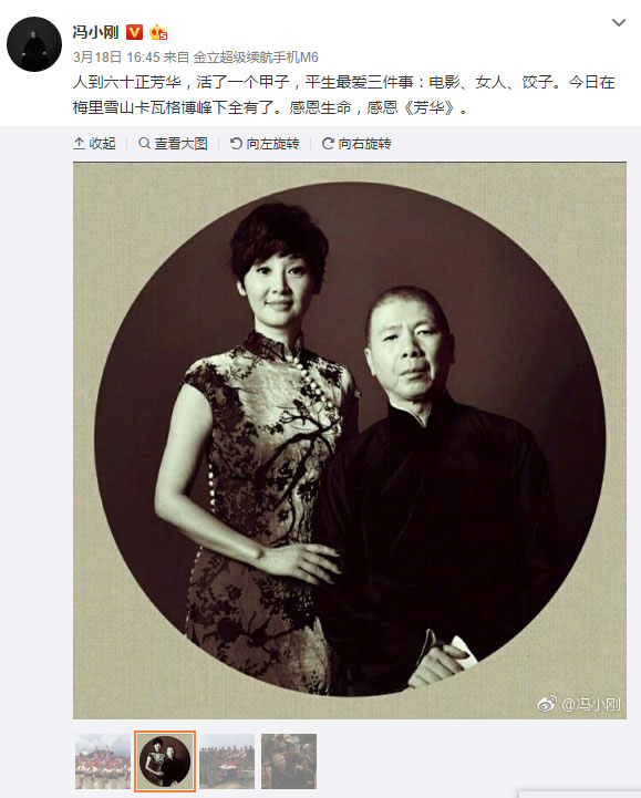 3月18日是冯小刚的60虚岁的生日,当天下午,冯小刚晒出与妻子徐帆的合影,以及自己导演的新片《芳华》片场照,感叹道:“人到六十正芳华,活了一个甲子,平生最爱三件事:电影、女人、饺子。今日在梅里雪山卡瓦格博峰下全有了。感恩生命,感恩《芳华》。 ”