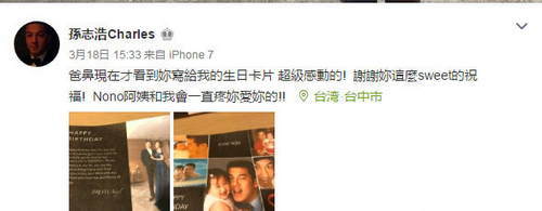 贾静雯与孙志浩离婚后,各自找到幸福,女儿梧桐妹也和父母另一半关系融洽,18日孙志浩在微博曝光梧桐妹给他的生日祝福,信中梧桐妹用英文对小妈林若亚赞不绝口:“爹地生日快乐,你人生中遇见一个完美女孩,你要好好珍惜她,因为她真的很棒!”