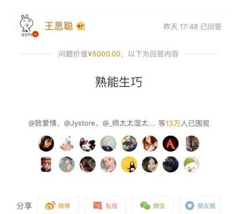 王思聪于3月25日傍晚17:48回答了这一问题,这是王思聪首次通过微博问答回答网友提问,令人惊讶的是,答案只有4个字:“熟能生巧”,但是更令人惊讶的是,在微博上迅速有数万人围观了这一问题。截至3月27日中午,围观这一问题的微博用户达16.7万人。