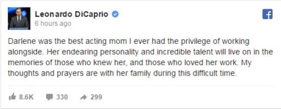 “小李”莱昂纳多获悉达尔莱尼死讯后,也在Facebook留言悼念,大赞对方是最好的荧幕母亲,很荣幸可以跟对方合作。达尔莱尼的为人及才华会留在认识她的人及喜爱她作品的人回忆中,愿祷告在这艰难时刻跟达尔莱尼的家人同在。