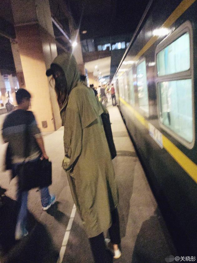 从照片可以看出来关晓彤搭乘的是夜里的火车,她身穿墨绿色长款大衣,黑色裤子,白色鞋子,打扮十分低调。