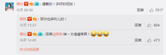 值得一提的是,《欢乐颂》中樊胜美扮演者蒋欣也来凑热闹,“赶紧的!多好的妞儿!”而杨烁也催蒋欣“麻利儿的”,结果对方回应称:“唉,太过优秀啊!”