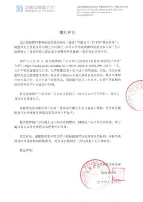 据香港媒体报道,英皇娱乐有限公司、谢霆锋、霍汶希委托律师事务所,就近日遭受网络诽谤一事发声明,声明指2017年5月24日微博用户“未来网”发布了一篇文章称霆锋已分手,并称霍汶希印证该说法。