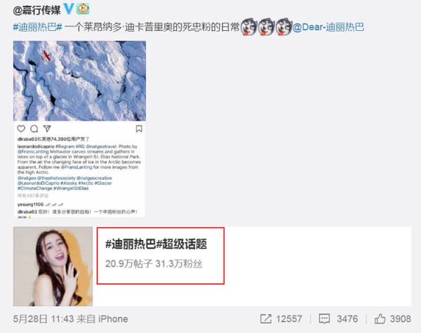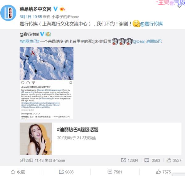 而热巴的公司嘉行专门截图发微博,说这是莱奥纳多死忠粉的日常。