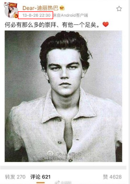 早在2013年热巴的微博里,我们就能看得到小李子的身影。