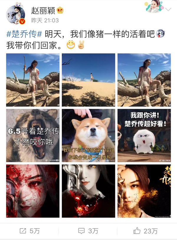 四日晚,赵丽颖发博,足足九宫格,前三张是新的剧照,中间三张是加了宣传语可爱的动物和卡通照片,末尾是三张被改动过的楚乔宣传海报。