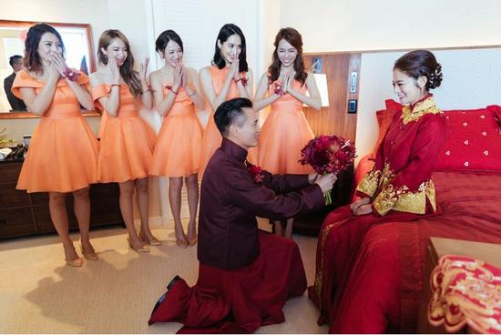 网易娱乐专稿6月6日报道 安以轩今天(当地时间五日)在夏威夷大婚,澳门德晋集团CEO陈荣炼一早率10名兄弟团浩浩荡荡迎娶,安以轩则有10位姐妹花负责考验新郎诚意,包括安氏企业刘品言、白歆惠、陈乔恩、夏于乔、Linda等人,一见到新郎兄弟团就先要大红包,还搞笑检查厚不厚,场面活泼喜气。