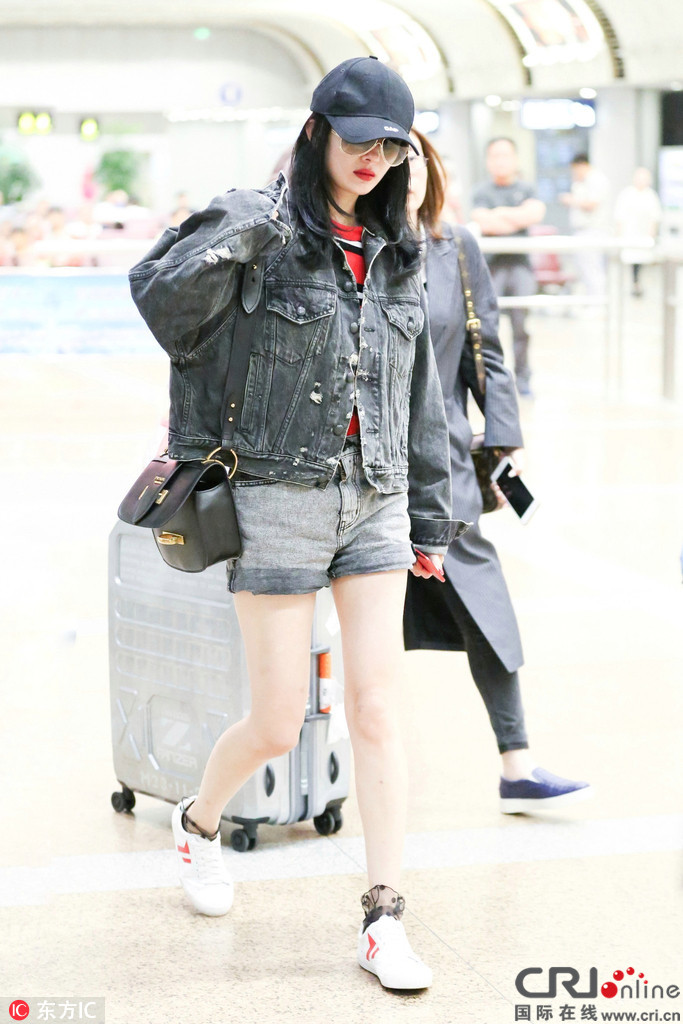 2017年6月7日,杨幂现身北京机场。大幂幂以一身超级减龄的牛仔造型现身,露出万年不变的超细美腿,秒变十八岁。