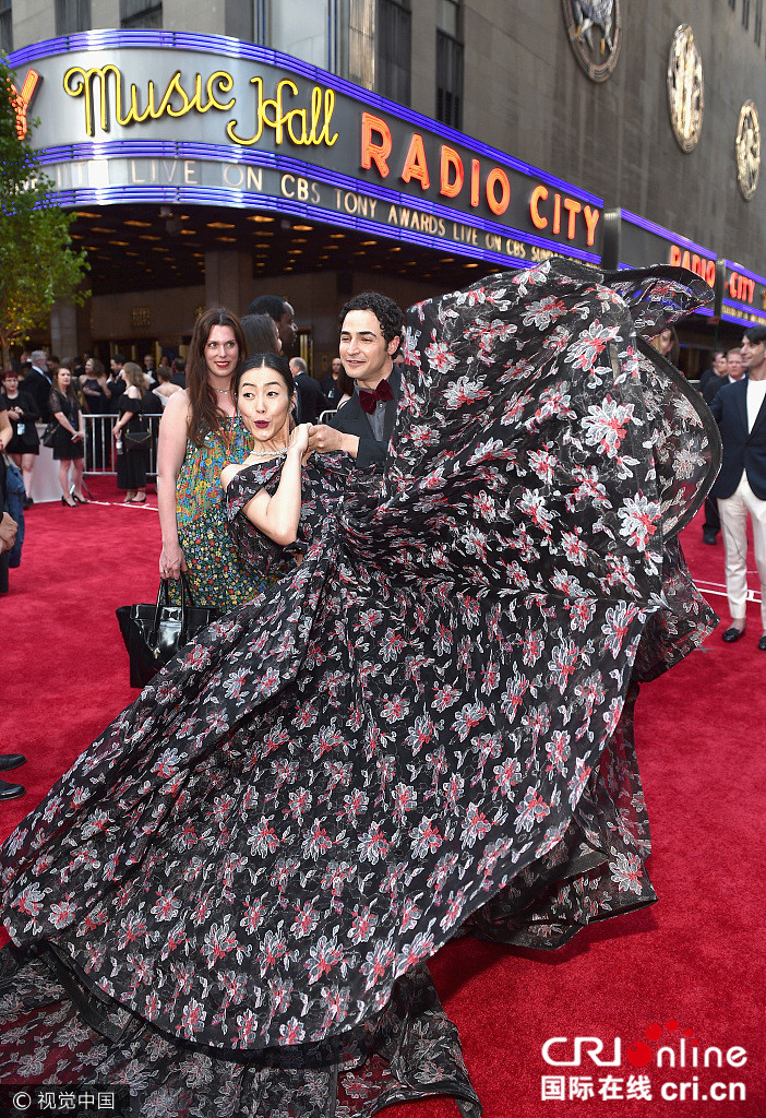 当地时间2017年6月11日,美国纽约,2017托尼奖颁奖礼(2017 Tony Awards)红毯。“大表姐”刘雯抹胸碎花长裙优雅迷人,获扎克·珀森 (Zac Posen)公主抱裙摆飞舞,两人浪漫起舞似童话中“王子与公主”。Bryan Bedder/Getty Images for Tony Awards Productions/视觉中国