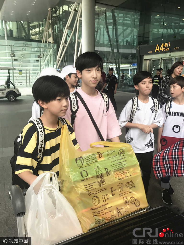 6月13日,来广州参加电影《变形金刚5》发布会的YHBOYS组合抵达白云国际机场,7个小男孩自己推着行李箱就出来了,成员们搭着肩边走边说笑,感情非常好!