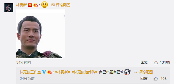 林更新微博发文称:“《楚乔传》里谁最八卦?”不少网友在微博下开启斗图回复模式,林更新和宇文怀的扮演者王彦霖也在评论区回复,与网友亲密互动。