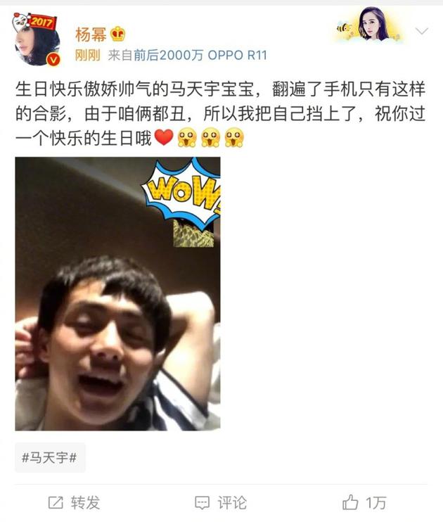 2017年7月12日,今天是马天宇生日,好朋友杨幂开玩笑放出“黑照”送祝福,随后秒删,又重发一条送上正经祝福,“希望我们友谊长存”,还不忘配上自己最爱的“憧憬”表情,徒留马天宇在评论区嘶吼:“我不需要面子吗!”