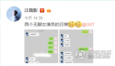腾讯娱乐讯 21日下午演员江疏影在微博晒出与好友聊天截图,从想剪短发聊到自证单身,反套路出击意思套出对方恋情,配文“两个女演员无聊的日常”并@GXT引发网友猜测。不过眼疾手快的网友发现,其实在21日凌晨江疏影便已发过同样内容的微博并@关晓彤随后秒删,不知是恋情确有其事还是截图细节暴露隐私才删除?