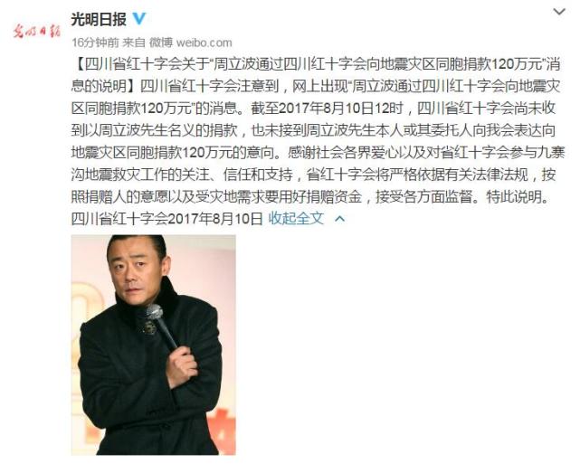 不过在中午事件似乎出现了反转,据光明日报的官微报道称,截至8月10日中午12时,四川省红十字会并未收到以周立波先生名义的捐款,也未接到周立波先生本人或其委托人向该会表达向地震灾区同胞捐款120万元的意向。