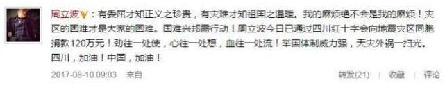 8月10日,周立波发文宣布向四川地震灾区捐款120万元,并委婉表达对陷入持枪藏毒风波的心境,称“有委屈才知正义之珍贵,有灾难才知祖国之温暖。我的麻烦绝不会是我的麻烦!灾区的困难才是大家的困难。国难兴邦需行动!周立波今日已通过四川红十字会向地震灾区同胞捐款120万元!劲往一处使,心往一处想,血往一处流!举国体制威力强,天灾外祸一扫光。四川,加油!中国,加油! ”
