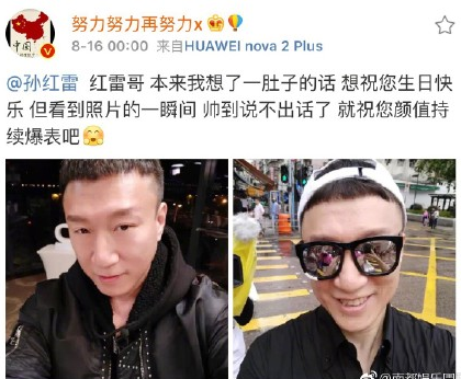 孙红雷今天生日,零点点刚过,“鸡条”兄弟张艺兴黄渤王迅就陆续在微博送祝福,兄弟们无一例外的祝愿孙漂亮的颜值持续爆表。8月16日是孙红雷的生日,凌晨刚过,好友黄渤便在微博上祝福孙红雷“孙美丽,生日合影还心机的戴眼镜,还找四十五度角,不管怎么说还是要祝你抚媚如貂蝉、妖艳赛妲己!永远孙美丽!!”就算是祝福语也不忘调侃下好友。