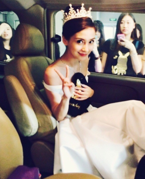 网易娱乐9月2日报道 9月1日粉丝晒出一组Angelababy出席活动的照片。照片中baby身穿白色露肩长裙,戴着皇冠,美辣妈摇身一变成公主。