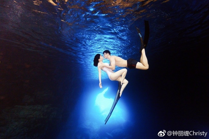 9月4日,钟丽缇在微博分享一组在海底和老公张伦硕拍的唯美写真,写道“好开心在塞班岛的蓝洞潜水,没想到蓝洞的水那么清,水下的景色那么美,希望以后有机会可以带孩子们一起来这里潜水。”照片中两人完美身材一览无遗,甜蜜拥吻狂撒狗粮。