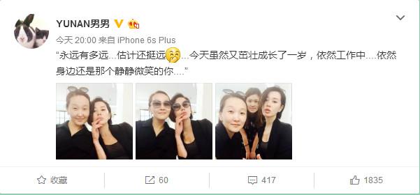 9月5日是余男的生日,依然在工作中的她在微博晒出了一组自拍美照,照片中的余男眼神迷离,动作撩人,性感的嘴唇格外吸睛。余男还在微博配文称:“永远有多远...估计还挺远...今天虽然又茁壮成长了一岁,依然工作中....依然身边还是那个静静微笑的你....”