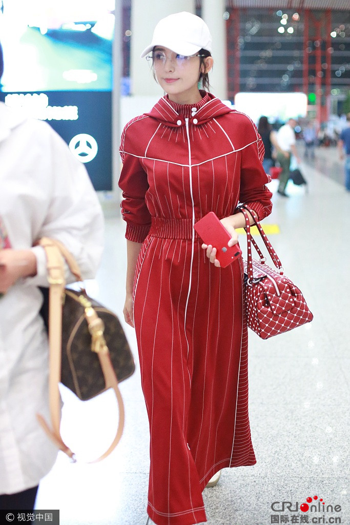 2017年9月11日讯,北京,9月11日,古力娜扎现身机场。古力娜扎身穿一袭及踝红裙,搭配红色包包和红色手机壳,美艳大气,吸睛十足,引迷弟远远痴望。娜扎托腮办理登机,表情放空,尽显软萌性格。图片作者:ALO/视觉中国