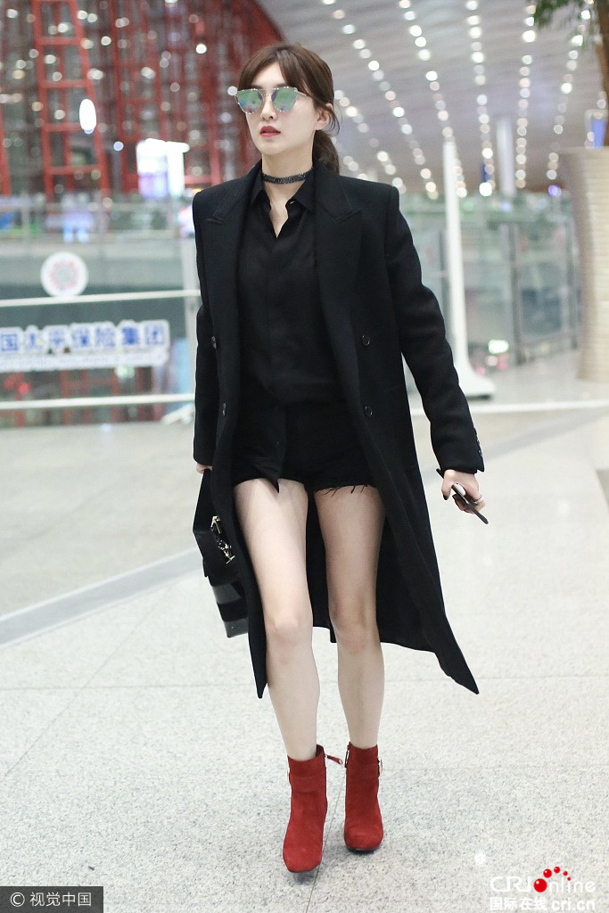 2017年9月18日讯,北京,17日,江疏影一身黑LOOK配红靴霸气现身北京机场,她戴墨镜上身穿黑色大衣,下穿黑色短裤,大秀美腿,脚踩红色高跟鞋时尚靓丽。