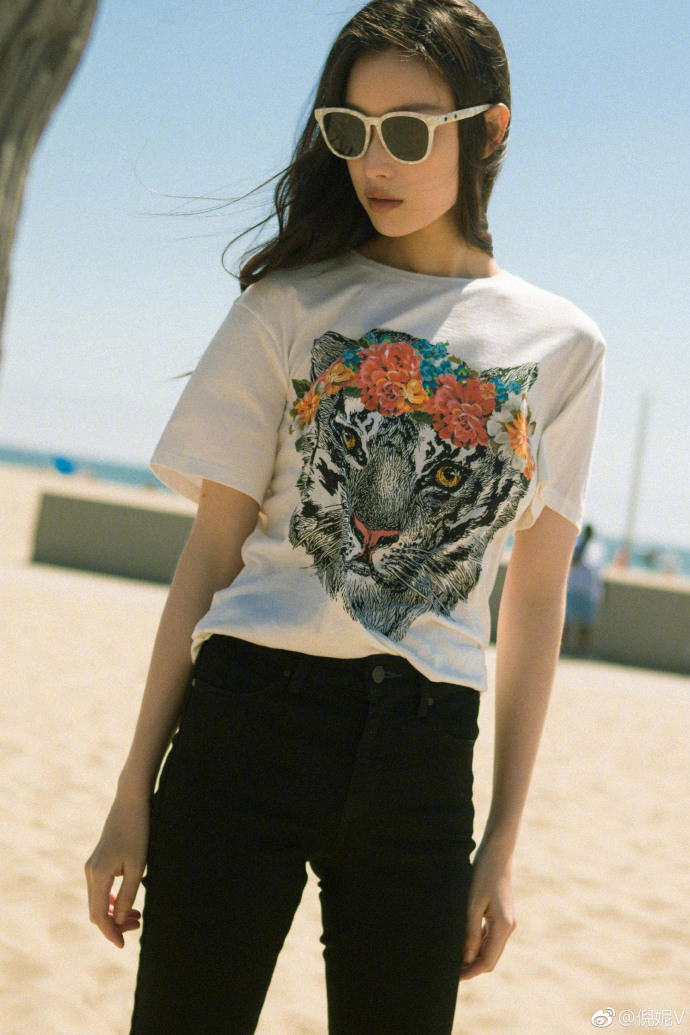 9月18日,倪妮未必晒出一组美照,照片中,她身穿白色印花T恤,搭黑色长裤,简约而又不失时尚,光着脚丫在沙滩上狂奔,女汉子属性暴露无遗。