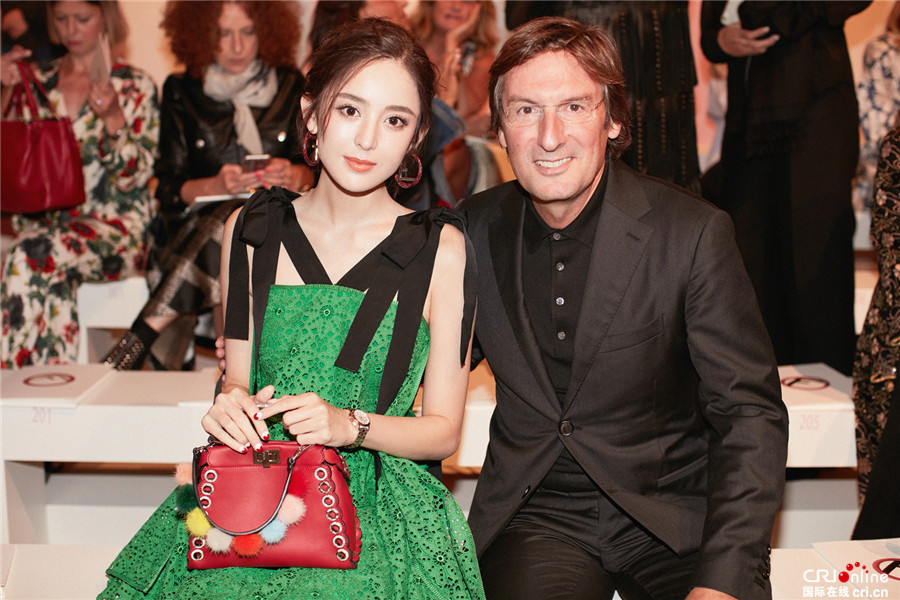 娜扎优雅米兰时装行 绿色蕾丝裙尽显清新仙女范儿