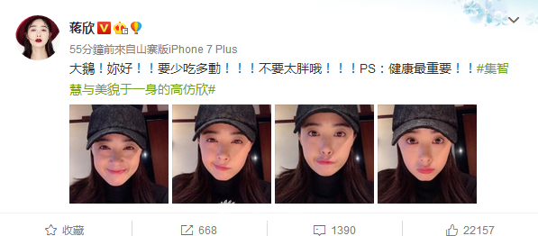 今日,奋战在减肥道路上的蒋欣晒出一组自拍,气色红润的她却难以遮挡双下巴。她更自我暗示要“少吃多运动”,告诫自己“不要太胖”。