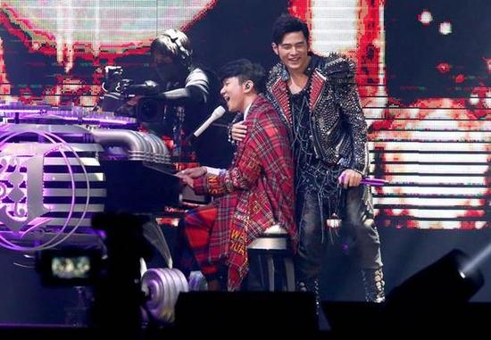 周董接着出场,从背后勾着林俊杰展现两人好友谊,并夸赞:“你是我心目中唱最好的男歌手。”更给他“行走CD”的称号,JJ反问:“昨天那位呢?”周董装作不知情询问,“昨天有人来吗?”