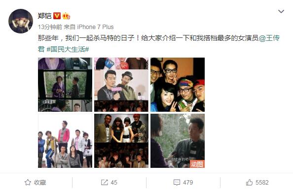郑恺晒与王传君合照:介绍一下和我搭档最多的女演员