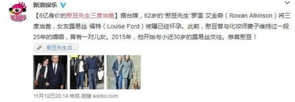 近日,有媒体报道,62岁的英国谐星“憨豆先生”罗温·艾金森(Rowan Atkinson)三度当爸,小他30岁的女友露易丝·福特( Louise Ford)已经怀孕了。