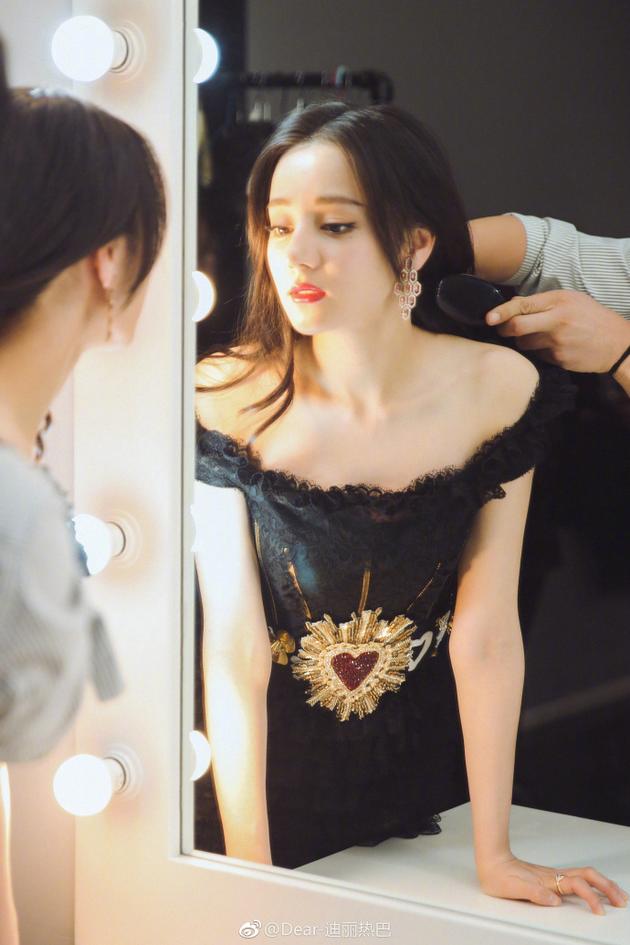照片为迪丽热巴在化妆间的对镜自拍照。照片中迪丽热巴身穿黑色蕾丝边长裙,双肩半露,锁骨精致诱人。肤白胜雪、烈焰红唇,眼眸微垂,就像“维纳斯”一样具有吸引力,十分性感魅惑。