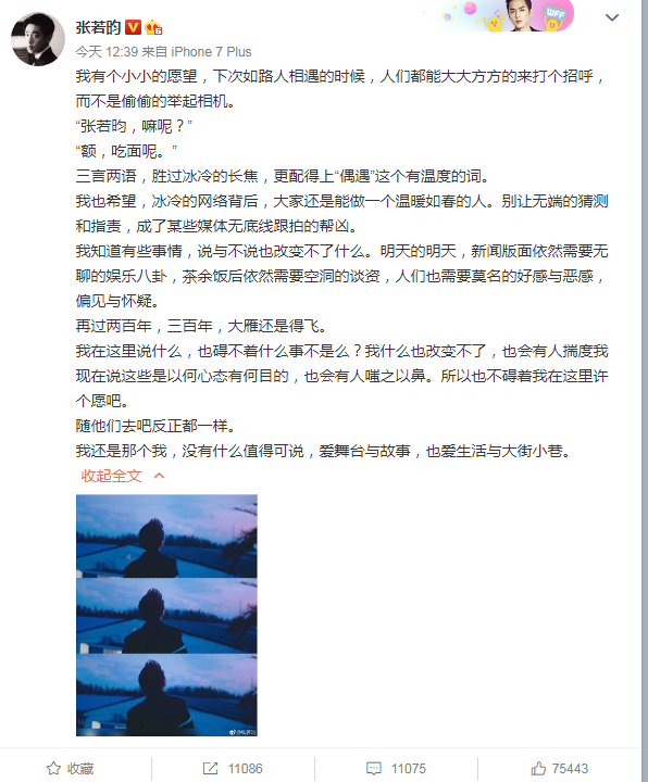 12月14日晚,有网友通过微博曝光偶遇张若昀唐艺昕微博毫无包袱坐在窗边吃午餐的照片,引起网友热烈讨论,甚至上了热搜。为此,就在今天中午,张若昀发微博长文谴责了偷拍者:“我有个小小的愿望,下次如路人相遇的时候,人们都能大大方方的来打个招呼,而不是偷偷的举起相机。”