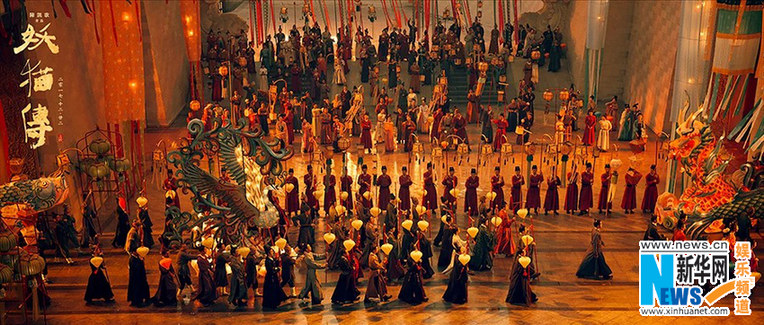 每个人心中可能都有一个“大唐梦”,然而历史和未来一样无法触摸、无法求证。怎样拍出一个能令大部分人满意的盛唐气象,《妖猫传》其实更多借鉴了文人画的表现手法,将中国画的“写意”发挥极致,以“意境”去展现想象中无限接近的大唐气象。影片的美术指导屠楠表示,“意境”是陈凯歌导演从一开始就强调的,“要传达中国人传统的审美、文化思维,并提出了以文人画的意境为全片的视听审美基础”为了展现这种东方审美,屠楠在做美术设计时,美学风格上主要参考于中国古典的“文人画”,“文人画的气韵和意境,这种东方审美是西方没有的。以文人画气质为指导基调,在造型上还参考了敦煌壁画、各个时期的墓穴壁画、寺院壁画,还有院体画、界画、舟船画等等。包括反复研究宗白华的《美学散步》,系统阐述了怎么把意境运用到园林、建筑、书法、绘画等各个方面。”
