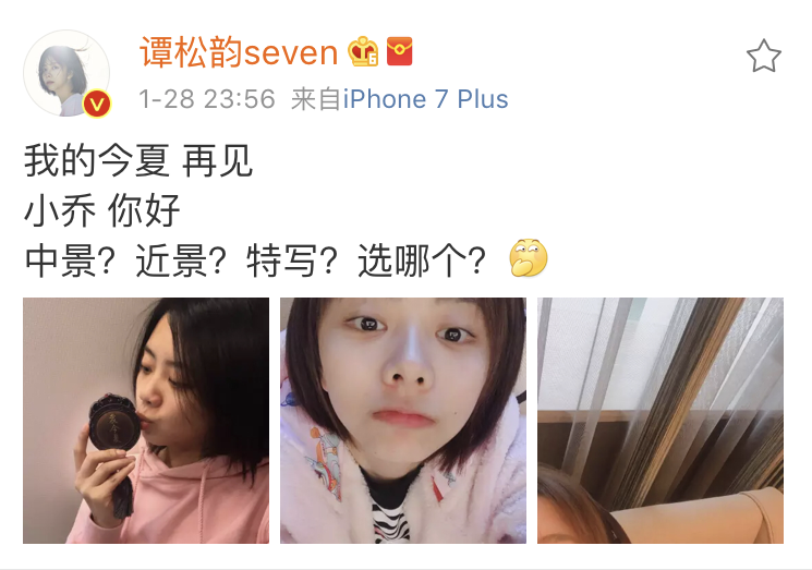 近日,正在上海拍摄电影《八月未央》的谭松韵在社交网站上晒出一组素颜自拍照,并配文“我的今夏 ,再见 。小乔 ,你好 。中景?近景?特写?选哪个?”谭松韵用三张不同景别的照片告别了《锦衣之下》中所饰演的角色袁今夏,同时公布了她将在电影《八月未央》中出演“小乔”一角。
