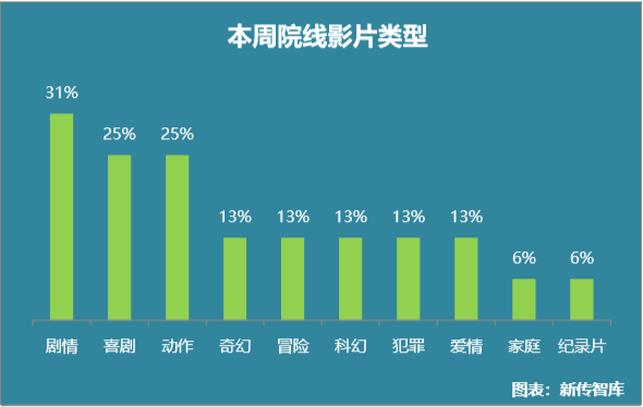 在类型分布方面,本周在映影片共有10种类型。其中,剧情片依旧为主要类型,占比虽略有下降,但依旧高达31%,名列类型榜首位;得益于《低压槽:欲望之城》、《巴霍巴利王2:终结》、以及《香港大营救》的扎堆上映,动作类型以25%的占比与喜剧类型齐平;奇幻、冒险、科幻、犯罪、爱情均占比13%。结合票房榜单不难看出,科幻、冒险、犯罪类型虽然占比不高,但是均集中在票房成绩突出的影片中,例如长期盘踞榜单前列的动作科幻片《头号玩家》、科幻冒险片《狂暴巨兽》,徐峥最新犯罪大片《幕后玩家》、以及《低压槽:欲望之城》。