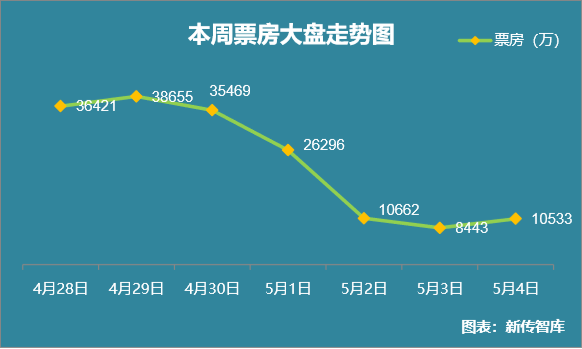 在总票房方面,4月28日- 5月4日的电影大盘报收16.4亿元,与上周相比翻了近4倍,涨幅较大。最主要的原因无疑是“五一黄金周”的到来。2018年“五一档”(4.29-5.1)票房创收累计10.1亿元,较去年同期增长了36.19%。从单日票房来看,热映趋势从4月28日就已经开始,当日票房达到3.6亿,甚至高于“五一”假期大部分的单日票房成绩 。