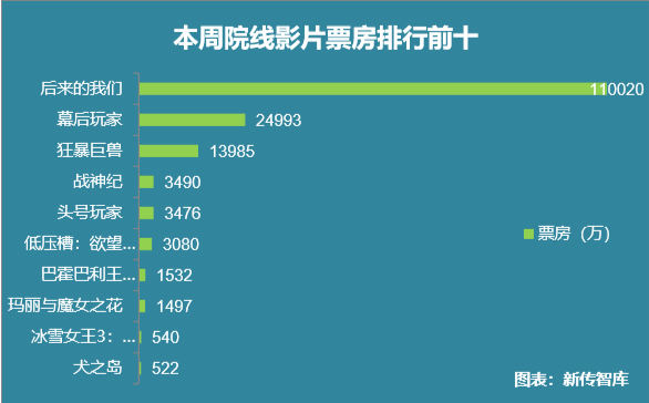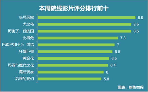 在评分方面,除《后来的我们》,本周大部分电影均在及格分以上。其中《头号玩家》依旧以8.9份稳居榜首;大幅删减24分钟的印度新片《巴霍巴利王2:终结》依旧延续了自《摔跤吧爸爸》之后印度电影的高口碑情况;《玛丽与魔女之花》豆瓣评分6.4位列榜单第八,带着吉卜力风格离开的米林宏昌明显未能交出一份令观众满意的答卷,“形式而神不似”又缺乏个人风格的表现使得该片陷于尴尬境地。