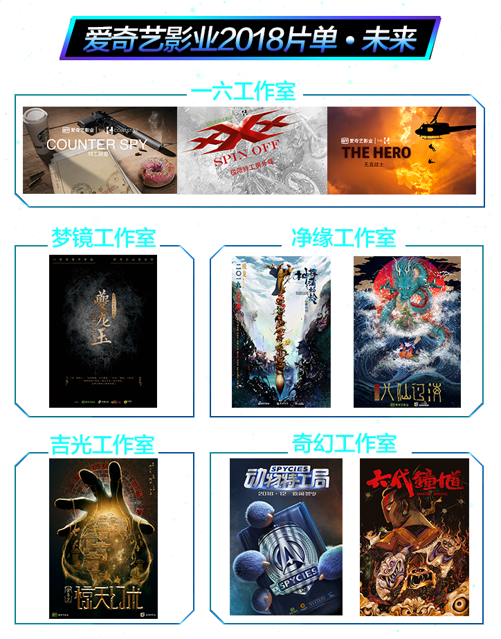 与此同时,爱奇艺影业集中发布了2018年度9部开发中项目,涵盖当下华语电影极具价值的多元影片类型。包括携手美国The H Collective电影公司将联合推出多部具有国际影响力的跨国合作巨制:《特工联盟》、《无言战士》等。除此之外,原创超级古风IP系列《夔龙玉》、以及精品合家欢动画巨制《动物特工局》、《六代钟馗》等多部影片均已投入研发、制作。