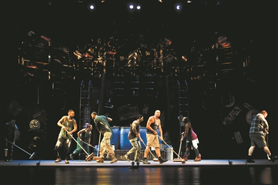 “唰唰唰!砰砰砰!”《STOMP》在扫帚摩擦和敲击着舞台的声响中拉开帷幕。报纸、火柴盒、洗手槽、饮水机桶、超市购物车……生活中平淡无奇的物品,在8位表演者的手中焕发出节奏和韵律。一人独奏、两两搏斗、四人高空腾跃激荡炫酷的打击乐、八人整齐划一融合了木棍敲击的踢踏、十余大小铁桶高空抛掷炫目惊心的杂技、夜空中伴着打火机的“呯呯”声亮起明明灭灭的星星点点……各种层出不穷的创意和玩法让人啧啧赞叹,而富有律动的节奏让人忍不住要跟着一起跺脚和摇摆。而当演出进入高潮段落,表演者们爬上挂满乐器的背景板立面,开启一轮悬挂式敲打,塑料桶、消防器、锅盖……一堆“破铜烂铁”在乐队的敲击下,带来重金属般充满爆发力的摇滚现场,如高压电般震撼人心。