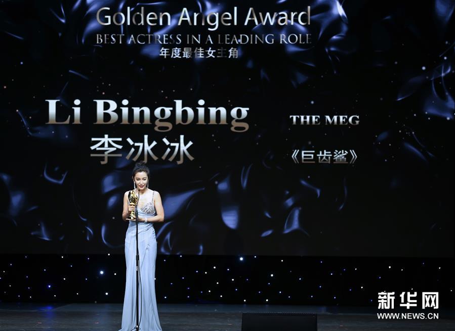 10月30日,在美国洛杉矶,获得年度最佳女主角奖的演员李冰冰上台领奖。新华社记者李颖摄