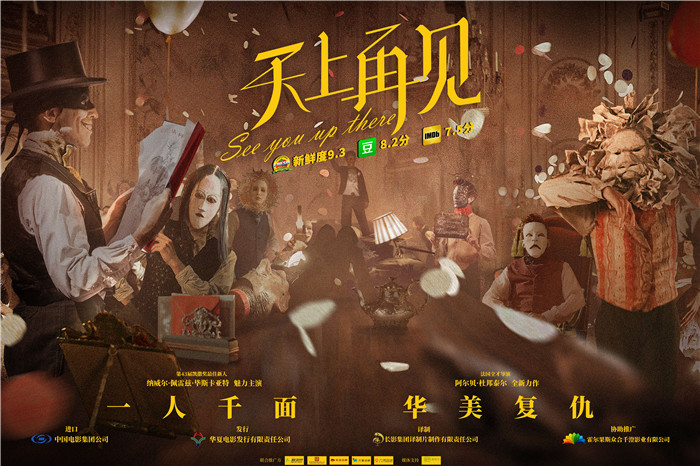 《天上再见》改编自法国殿堂级犯罪小说大师皮耶·勒梅特尔的同名小说,原小说曾被《时代周刊》、《世界报》、《纽约时报》等世界级媒体大力推荐,并于2013年获得有“法国诺贝尔文学奖”之称的龚古尔文学奖。故事以一战为背景,以一起震惊法国全国的烈士纪念碑诈骗案为线索,讲述了极具艺术天赋的银行家之子爱德华同善良憨厚的战友艾伯特,携手向金钱至上、拜金媚俗的欲望世界发起复仇的黑色幽默故事。