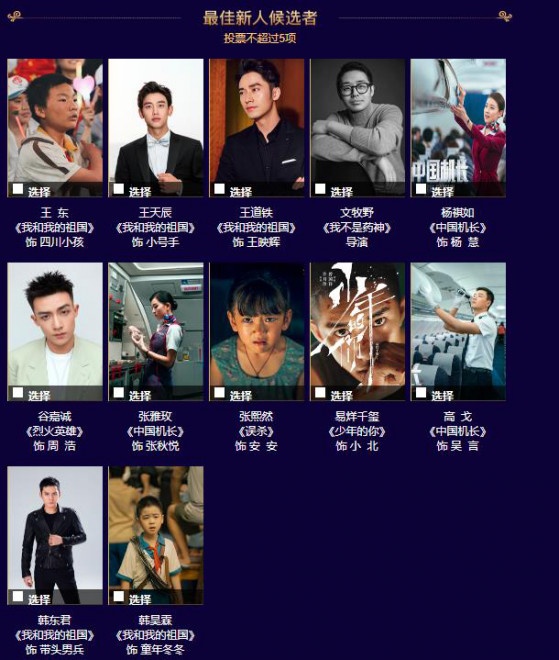 在《少年的你》中有出色表现的演员易烊千玺和《我和我的祖国》里饰演“童年冬冬”的韩昊霖、《我不是药神》的导演文牧野都出现在最佳新人候选者名单中。