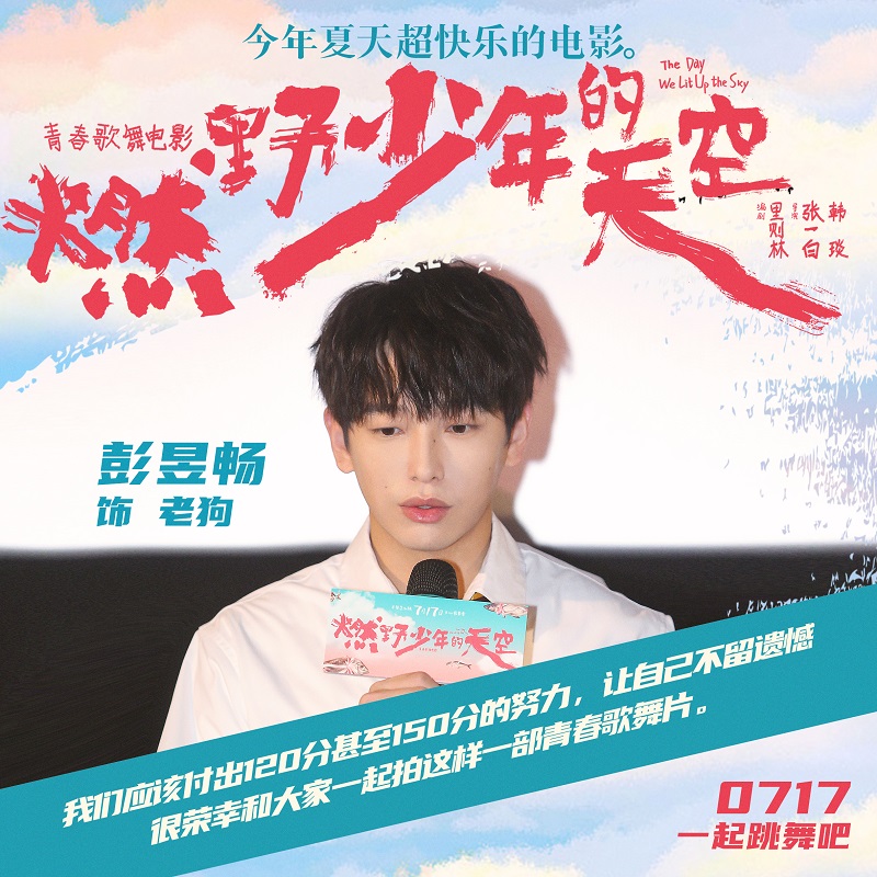 继电视剧后,再次在电影中出演“老狗”的彭昱畅说:“这部电影值得我们付出120分甚至150分的努力,才能让自己不留遗憾,很荣幸和大家一起拍了这样一部青春歌舞片。”