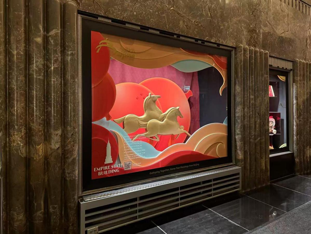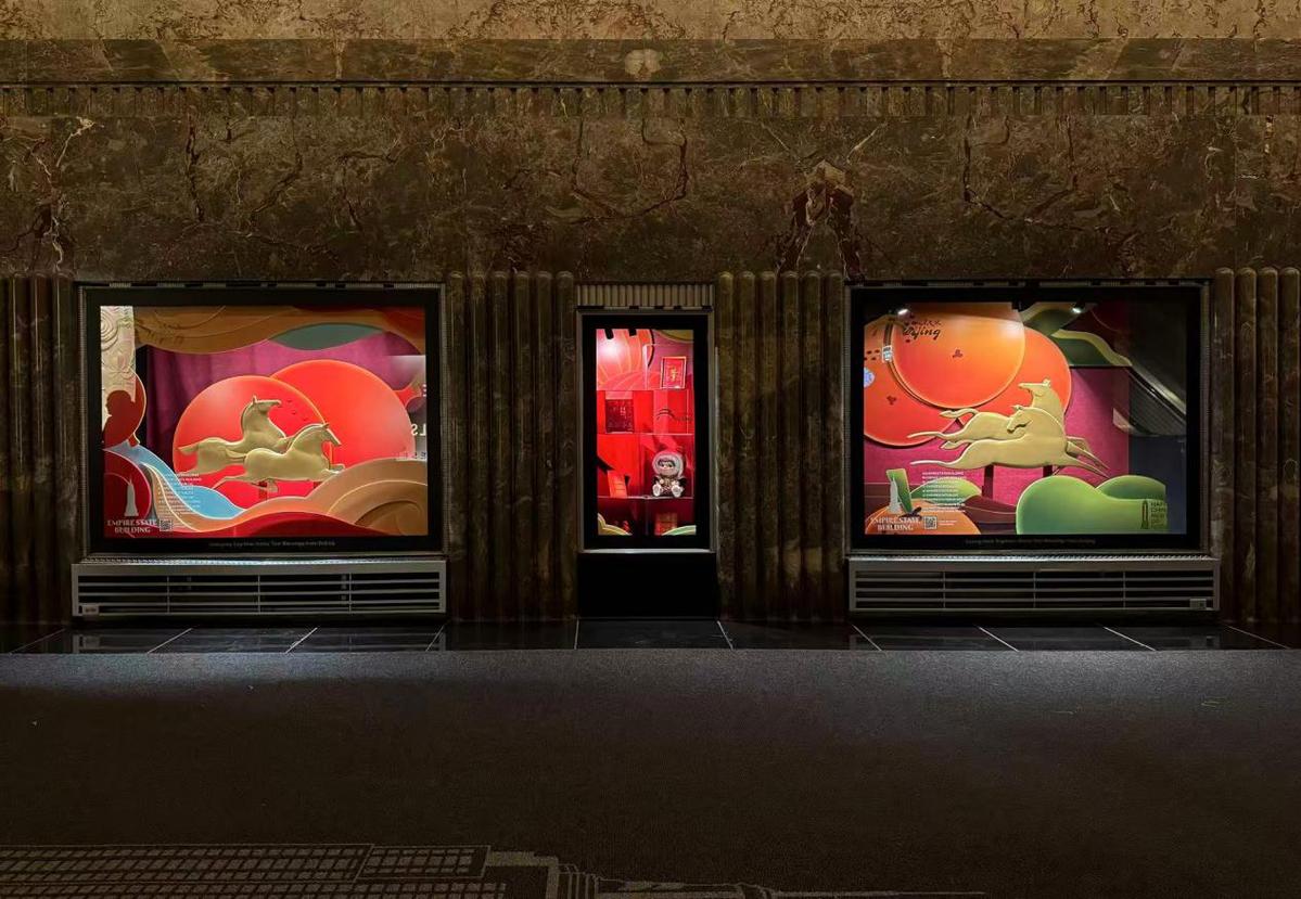 新春生肖橱窗展已经连续18年亮相帝国大厦,今年的“瑞马呈祥”主题橱窗由北京市文化和旅游局特别创作,以“齐头并进”“回望共鸣”为灵感,双马奔腾、祥云流转、葫芦隐现,不仅寓意吉祥,更是一场跨越文化的视觉对话。