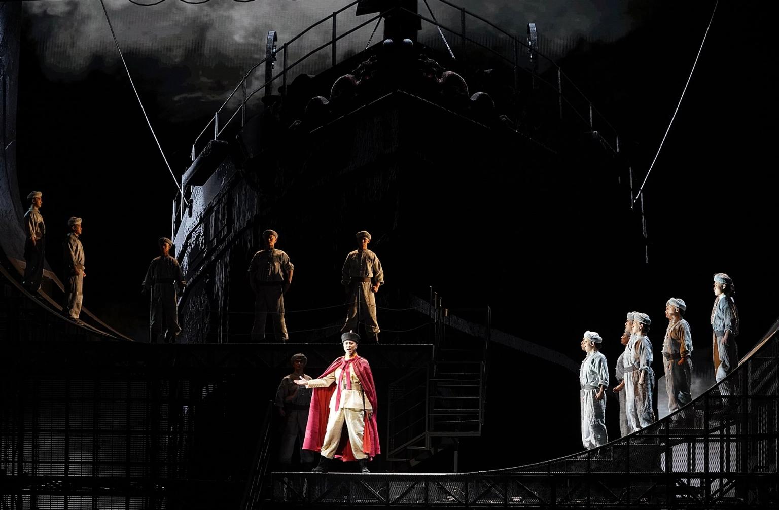 话剧《邓世昌》是国家大剧院继《林则徐》之后打造的又一部“历史人物”系列作品,于2024年纪念甲午海战130周年之际首演。在导演王筱頔看来,《邓世昌》的核心是要在腐朽衰败的时代底色中,凸显邓世昌永不熄灭、一生赴一战的“浩然之气”。与荡气回肠的家国叙事匹配的,是虚实结合、气势磅礴的舞台表达,矩阵式的战舰“龙骨”与平行“透屏”交叠出核心骨架,近500平方米的冰屏上,黄海激战的汹涌波涛与致远冲锋的画面以裸眼3D般的视效扑面而来。