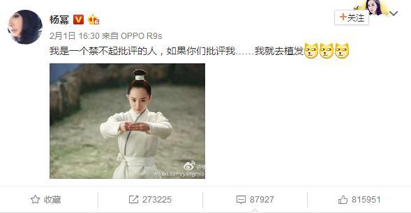 其实关于杨幂发际线的问题,在该剧曝光片花时就引起关注,当时杨幂还大方地自我调侃,“请好好珍惜一下现在还有头发的我,好好去看一下《三生三世》里面美丽的我,可能看不了几年了,好好珍惜吧。”随着剧集开播发际线再受关注,杨幂2月1日又发微博笑称:“我是一个禁不起批评的人,如果你们批评我……我就去植发。”就连杨幂工作室也发微博@杨幂,并写道:“嗨你好,2月份的行程需要加一个植发么?”
